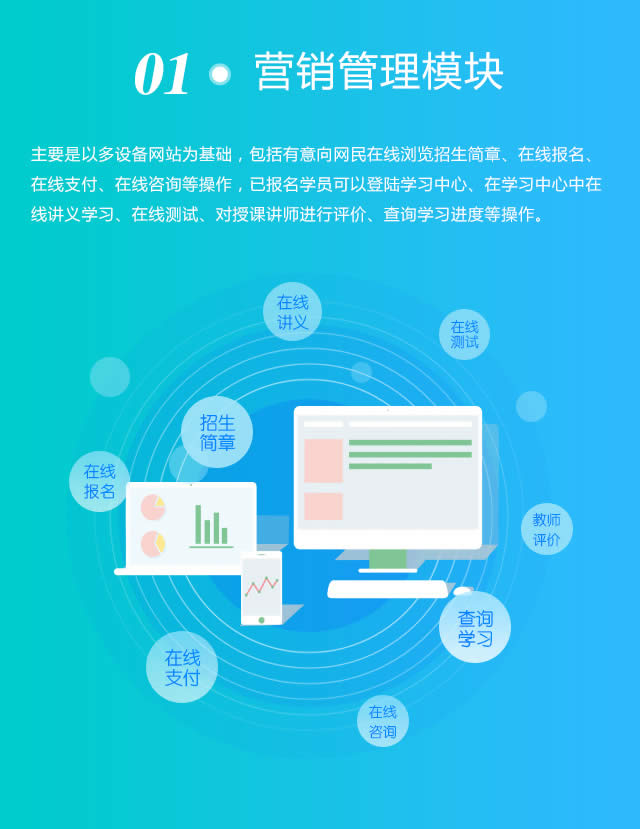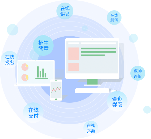 主要是以多设备网站为基础,包括有意向网民在线浏览招生简章、在线报名、在线支付、在线咨询等操作,已报名学员可以登陆学习中心、在学习中心中在线讲义学习、在线测试、对授课讲师进行评价、查询学习进度等操作。