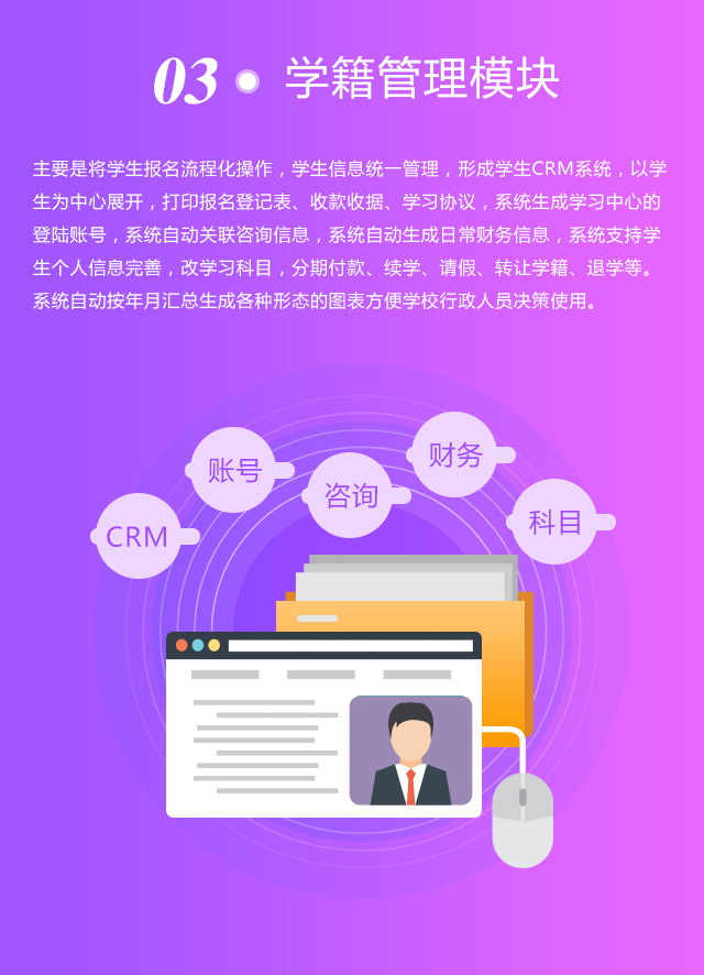 主要是将学生报名流程化操作,学生信息统一管理,形成学生CRM系统,以学生为中心展开,打印报名登记表、收款收据、学习协议,系统生成学习中心的登陆账号,系统自动关联咨询信息,系统自动生成日常财务信息,系统支持学生个人信息完善,改学习科目,分期付款、续学、请假、转让学籍、退学等。系统自动按年月汇总生成各种形态的图表方便学校行政人员决策使用。