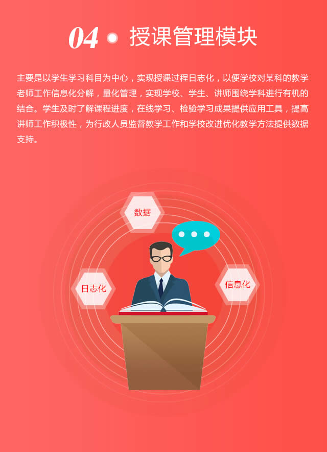 主要是以学生学习科目为中心,实现授课过程日志化,以便学校对某科的教学老师工作信息化分解,量化管理,实现学校、学生、讲师围绕学科进行有机的结合。学生及时了解课程进度,在线学习、检验学习成果提供应用工具,提高讲师工作积极性,为行政人员监督教学工作和学校改进优化教学方法提供数据支持。