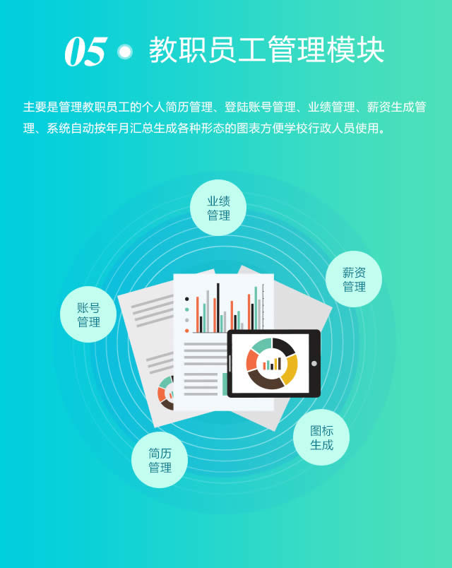 主要是管理教职员工的个人简历管理、登陆账号管理、业绩管理、薪资生成管理、系统自动按年月汇总生成各种形态的图表方便学校行政人员使用。